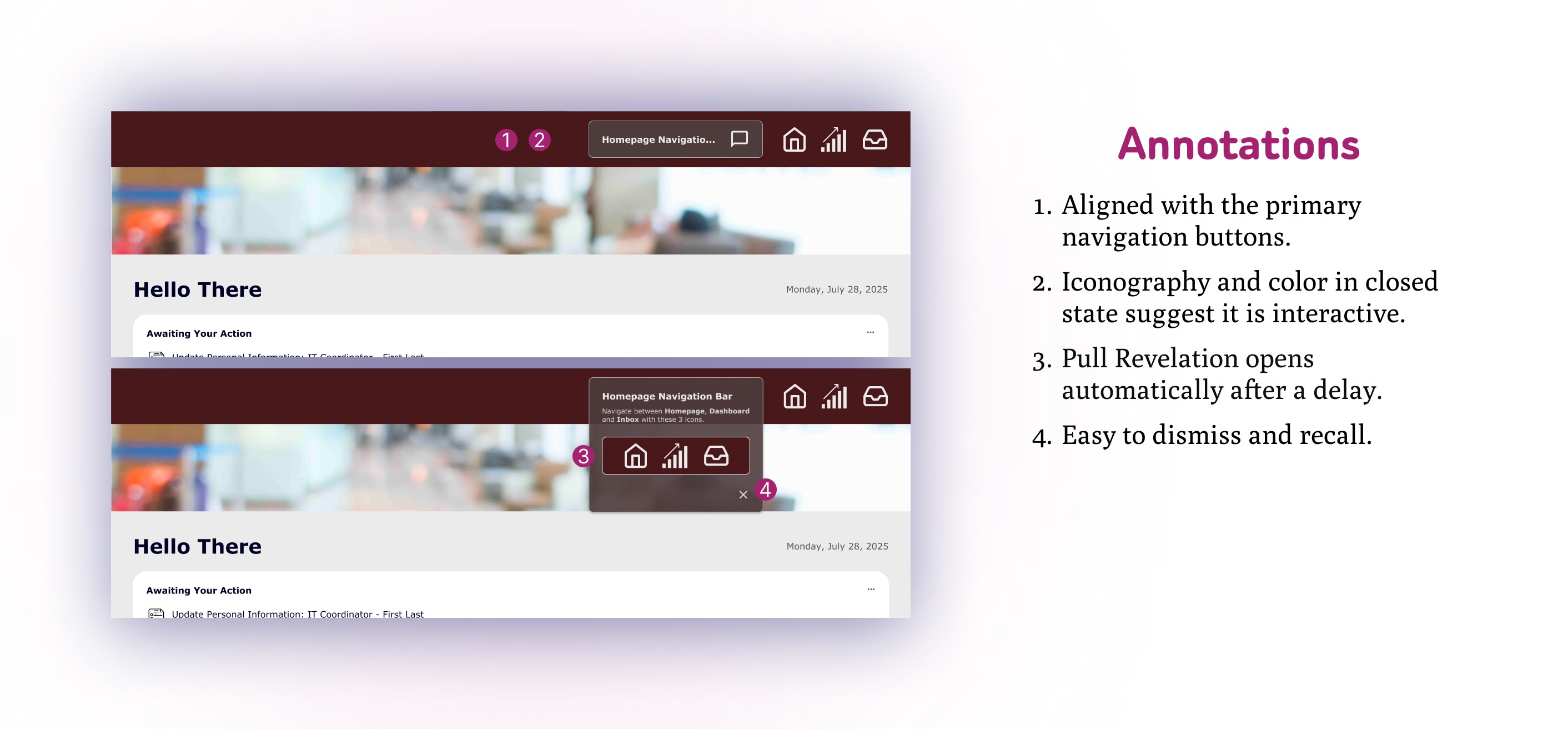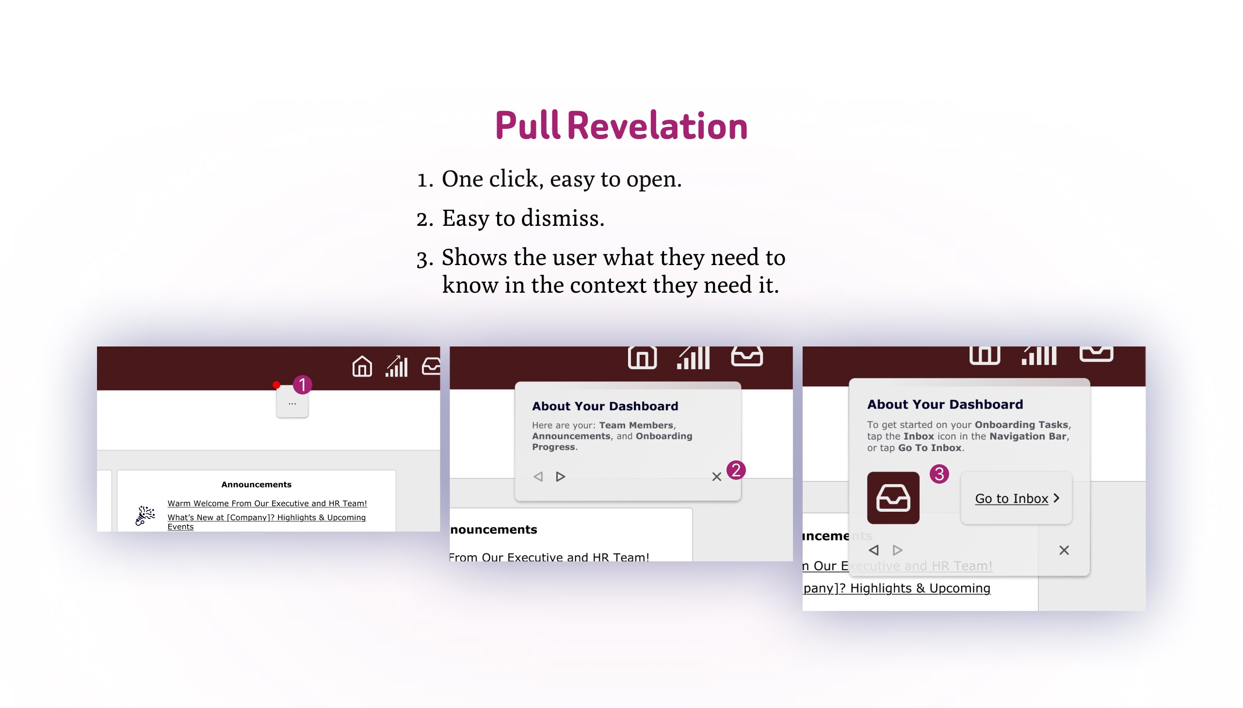 For pull revelations, I built a small pop-out near the top of the page that users would be able to easily open and close. It was non-invasive, yet still visible, and easy to dismiss and recall.