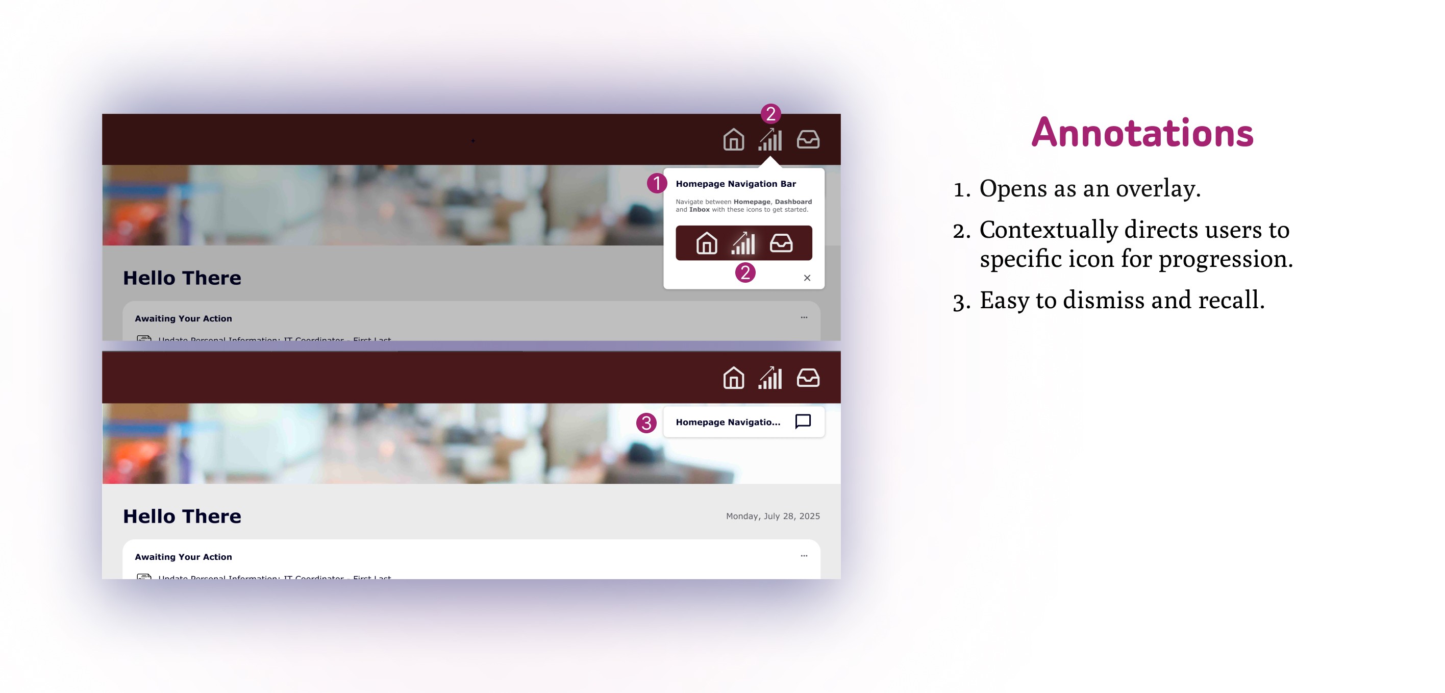 To solve the issue presented by the tutorials, I researched alternative methods to provide feature context while not being invasive. In my search, I came upon an article by Nielsen Norman Group titled Onboarding Tutorials vs. Contextual Help. What they found was similar to what I discovered from the results of the first round of user testing: Tutorials are counterproductive, are almost always skipped and disrupt the flow of the user. What they found that actually worked were pull revelations, which they defined as 'help content triggered by some signal that the user would benefit from that information at that moment.' The key to implementing pull revelations is to make them visible but not in the way and easy to dismiss and recall.