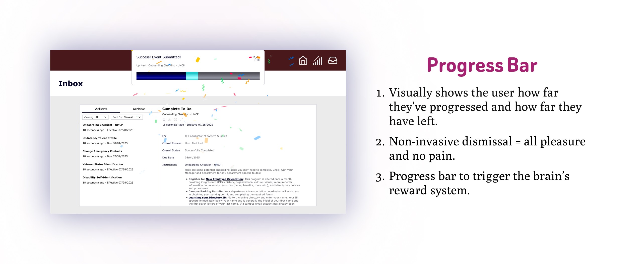 With gamification, I designed an overlay featuring a colored progress bar that dropped down when the user completed a task. The drop down overlay would dismiss itself a short period after dropping down, or the user could click anywhere on the page to dismiss it, making it more user-friendly.