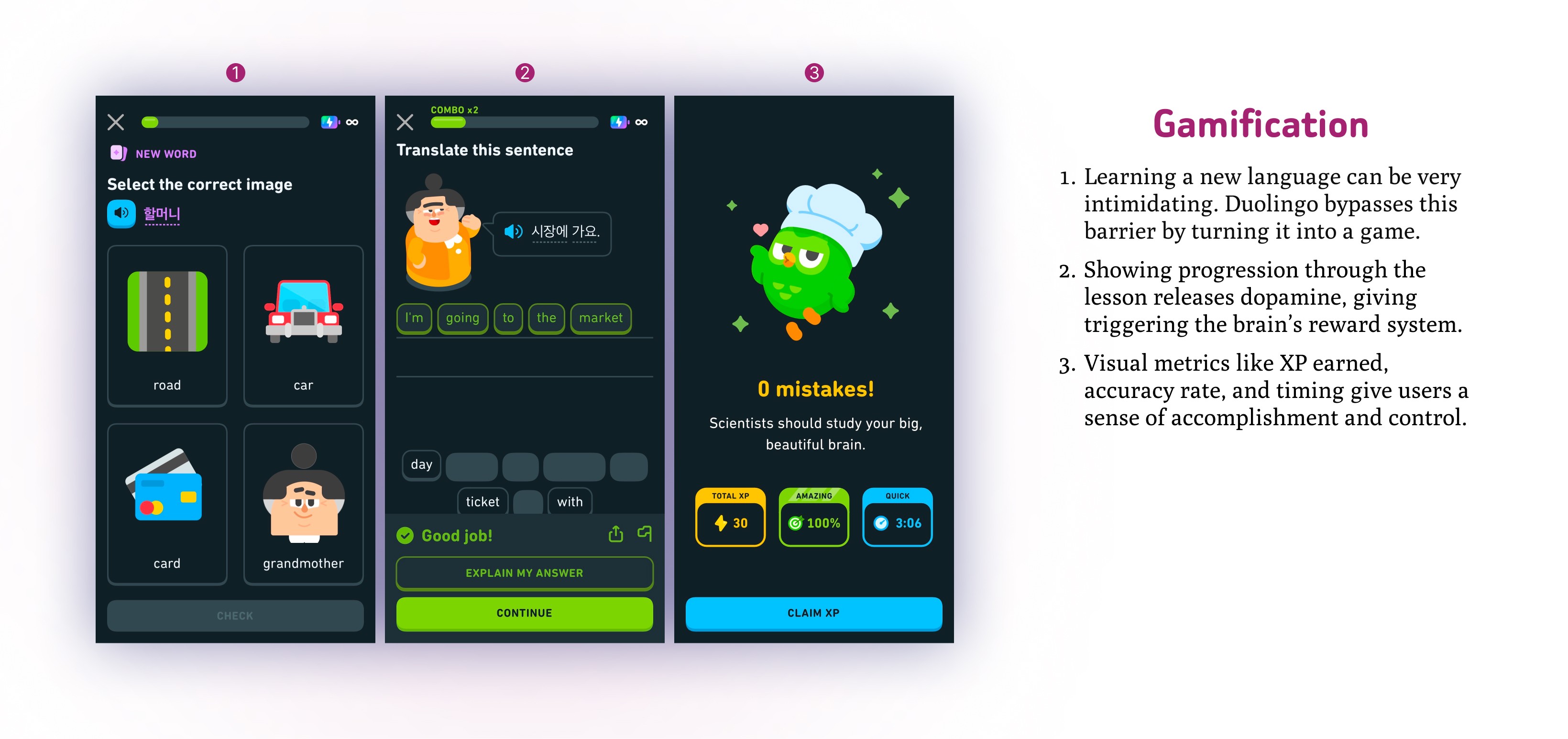 The other issue that came up during user testing was that users didn't feel a notable sense of fulfillment and that it was difficult to tell when submissions were successful. To address this, I looked for existing interfaces that used gamification. One company that really leans into gamification was the popular language learning app Duolingo. Duolingo reported that 80% of their user base enjoyed its gamification, and it was also noted that instant feedback gave users a sense of control with their progress.
