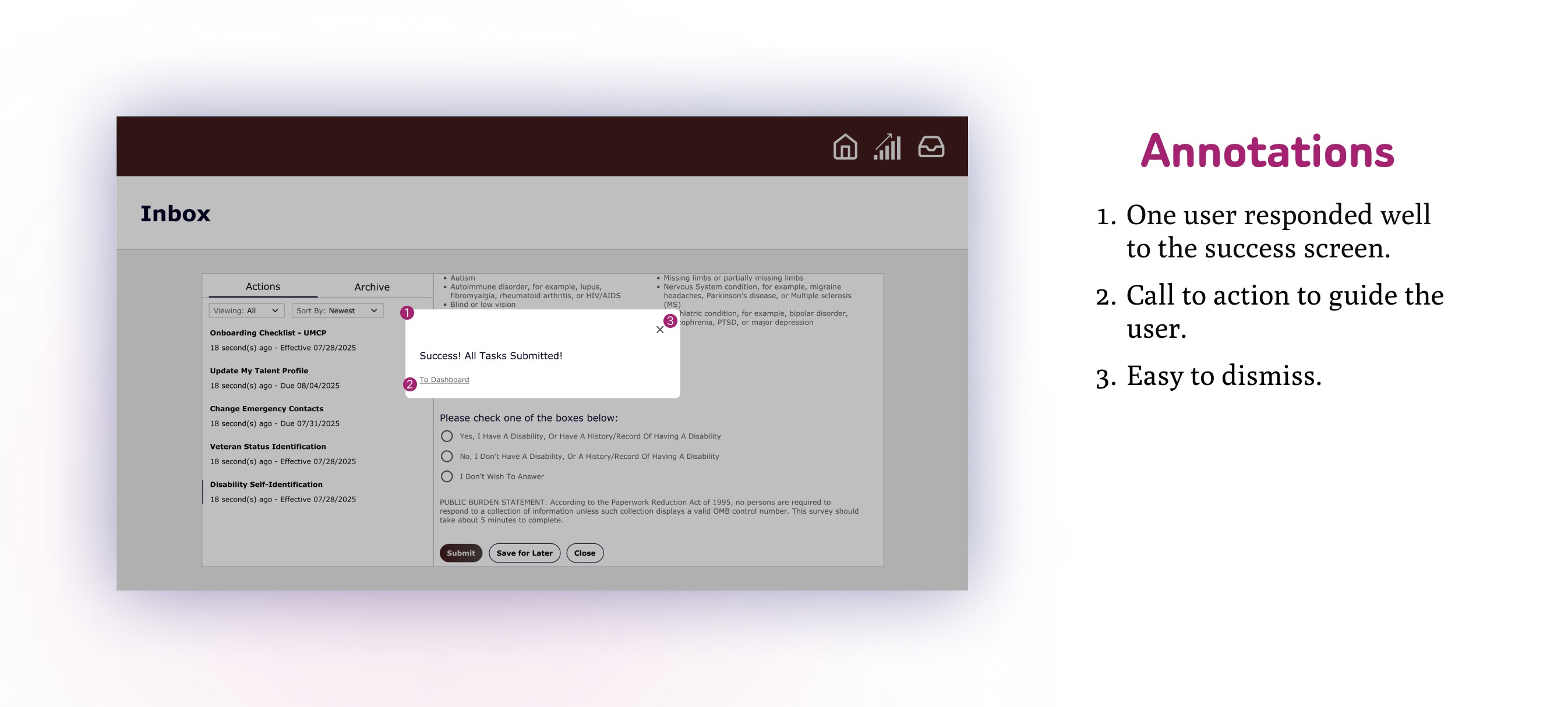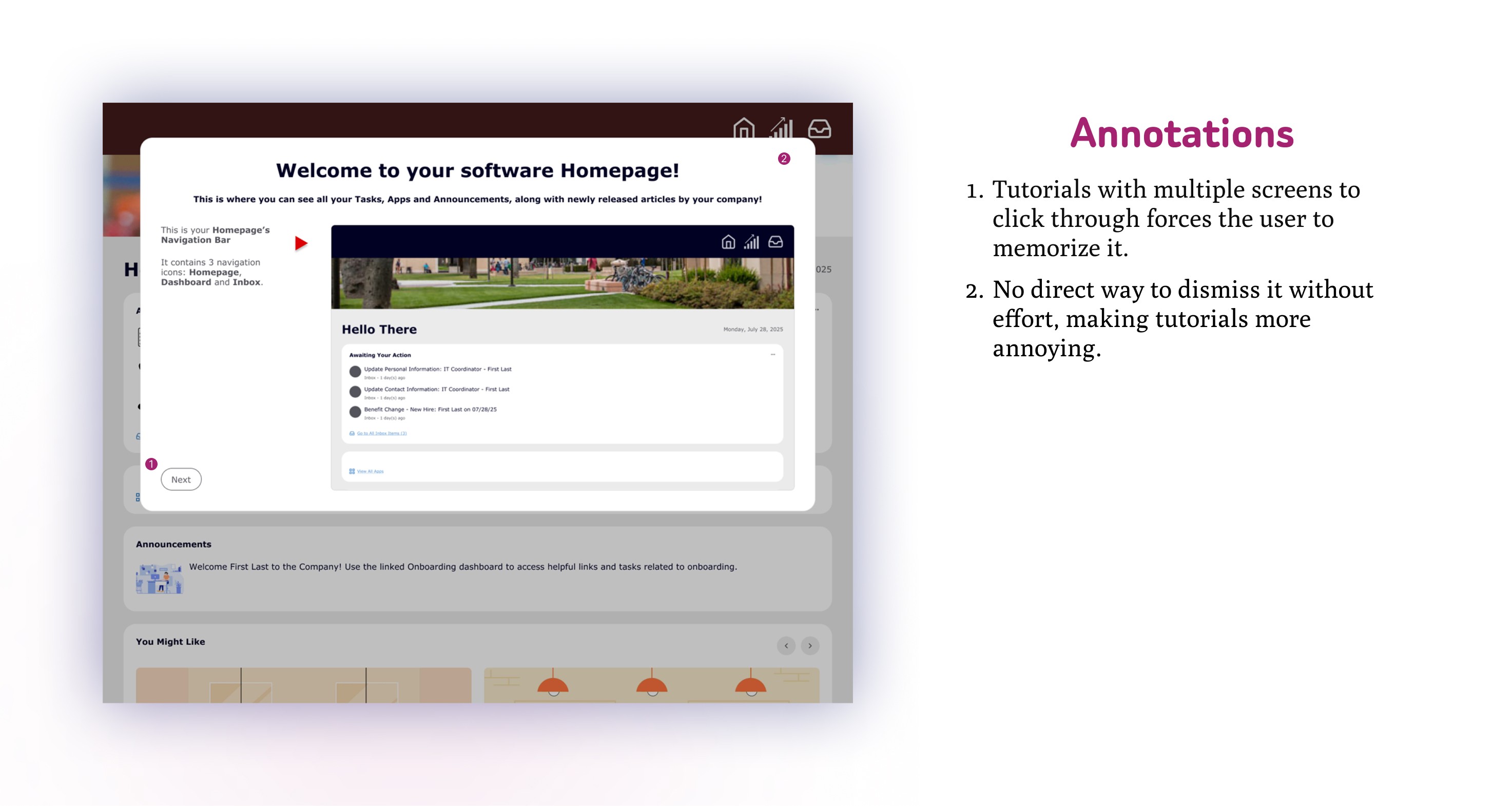 In order to collect some initial data, I began with a pilot test, designing a prototype for an HR onboarding app in Figma modeled after the Workday interface. In this prototype, I designed a homepage, a dashboard, and an inbox with onboarding tasks. There were 10 tasks in total for my user testers to complete. A multi-page tutorial was created for each of the main pages to gauge how users felt about tutorials, and a success overlay was also created for when the user completed all tasks.