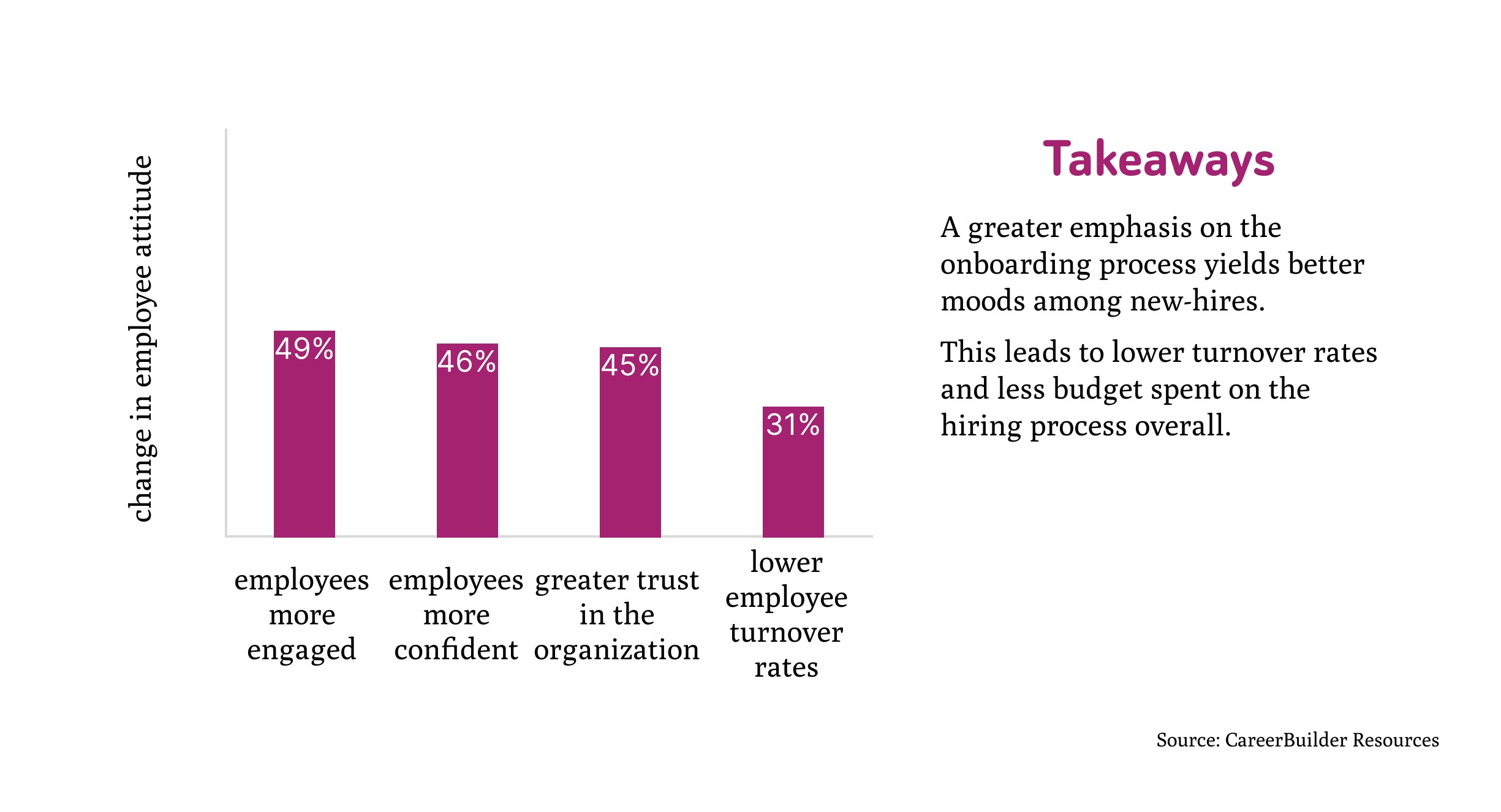 According to a study by CareerBuilder, employers who placed a large emphasis on their onboarding process reported that employees were more engaged (49%), more confident (46%), and had greater trust in the organization (45%). Employers have also reported 31% lower employee turnover rates.